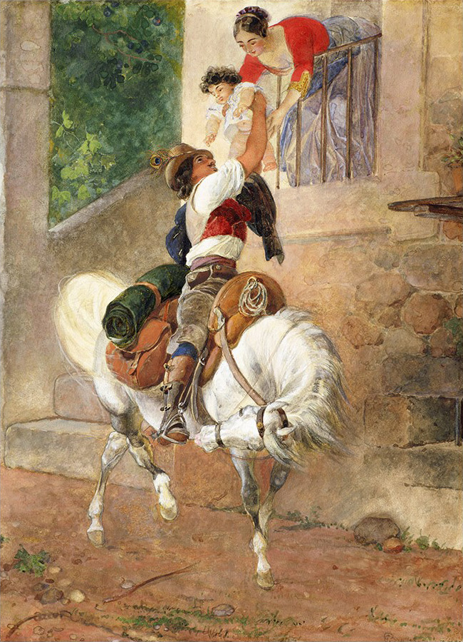 Beyaz bir atın üstünde çocuğunu yukarı uzatan adam ve balkonda eğilmiş kadının buluştuğu bu sahne, Karl Bryullov’un romantik duyarlılığı içtenlikli bir jestle ifade ettiği özel bir andır. Figürlerin sessizliği, ayrılık ve sevginin dramatik olmayan ama yoğun ifadesidir.