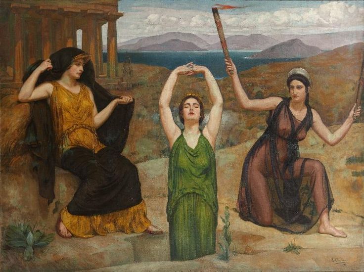 Eduardo Chicharro Agüera’nın “Demeter, Kore ve Hekate” tablosu, Eleusis Gizemleri’nin özünü görselleştirir: yaşam, ölüm ve yeniden doğuş döngüsü. Üç tanrıçanın kontrastlı jestleri ve sembolleri, insanlığın doğa ve varoluş üzerine en eski mitlerinden birini dramatik bir zarafetle resmeder. Tablo, akademik geleneğin figürel gücüyle mitolojik derinliği birleştiren güçlü bir örnektir.