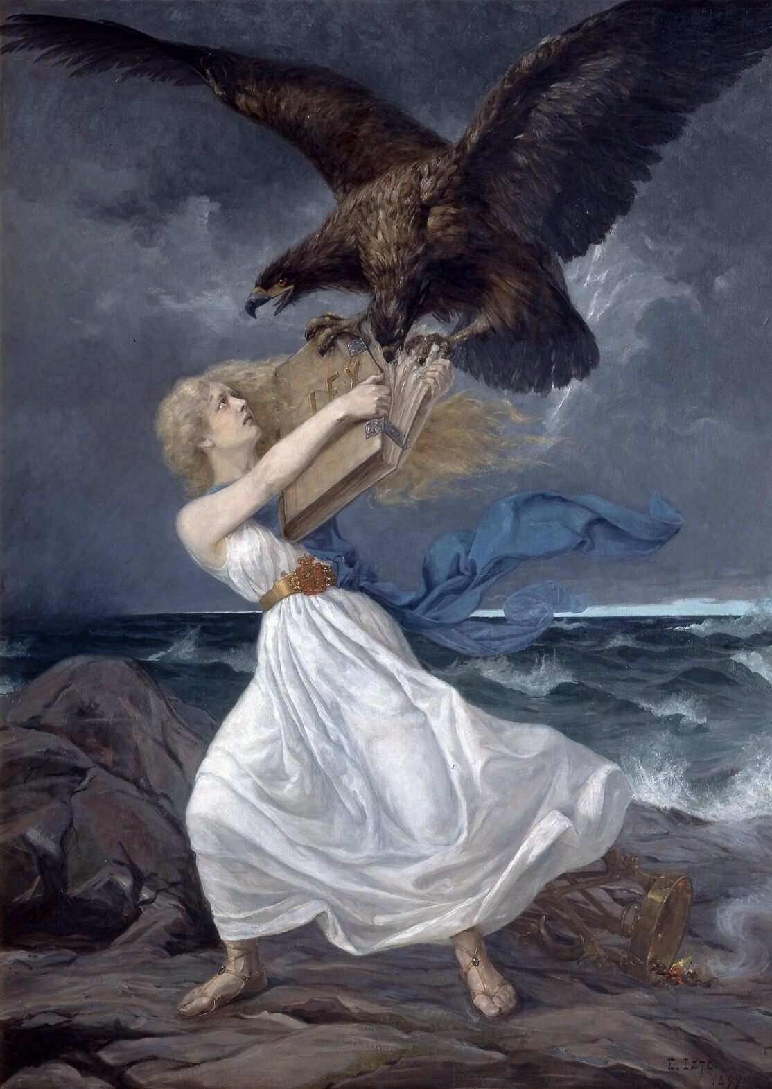 Bir kadın kitap tutarken, dev bir kartal kitaba saldırmaktadır. Arka planda fırtınalı deniz ve kara bulutlar görülür.