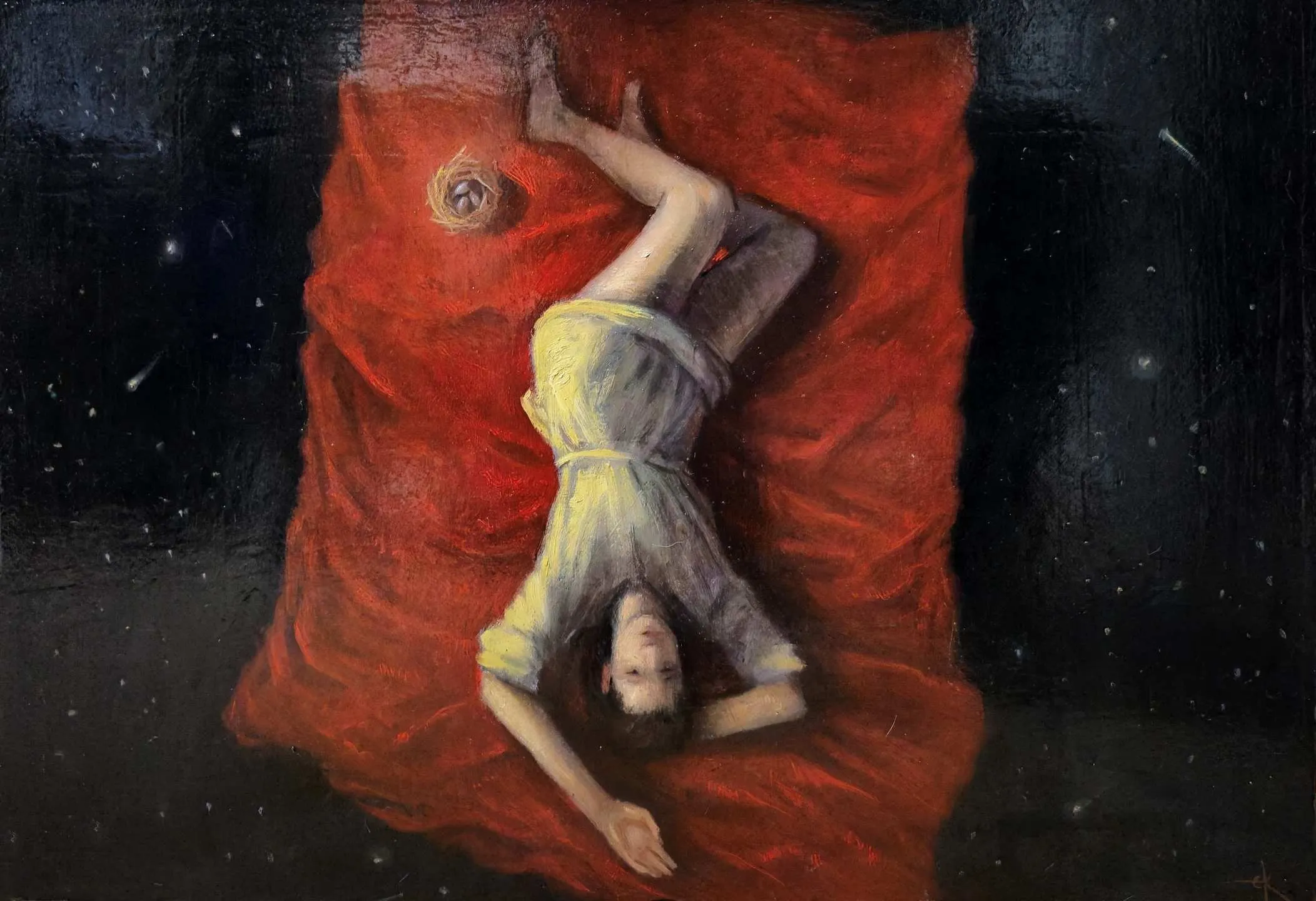 “Boşlukta” (2025, tuval üzerine yağlıboya, 35×50 cm), Korkmaz’ın bireyin evrenle ilişkisini görselleştirdiği etkileyici bir eserdir.