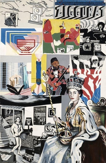 Ön planda taçlı, asalı ve küre taşıyan bir kraliçe beyaz törensel giysiler içinde otururken, arka planda yazılar, müzisyen figürü, iç mekân sahneleri, çıplak beden imgesi ve çeşitli popüler görsel parçalar beyaz bir yüzey üzerinde kolaj gibi dizilir.