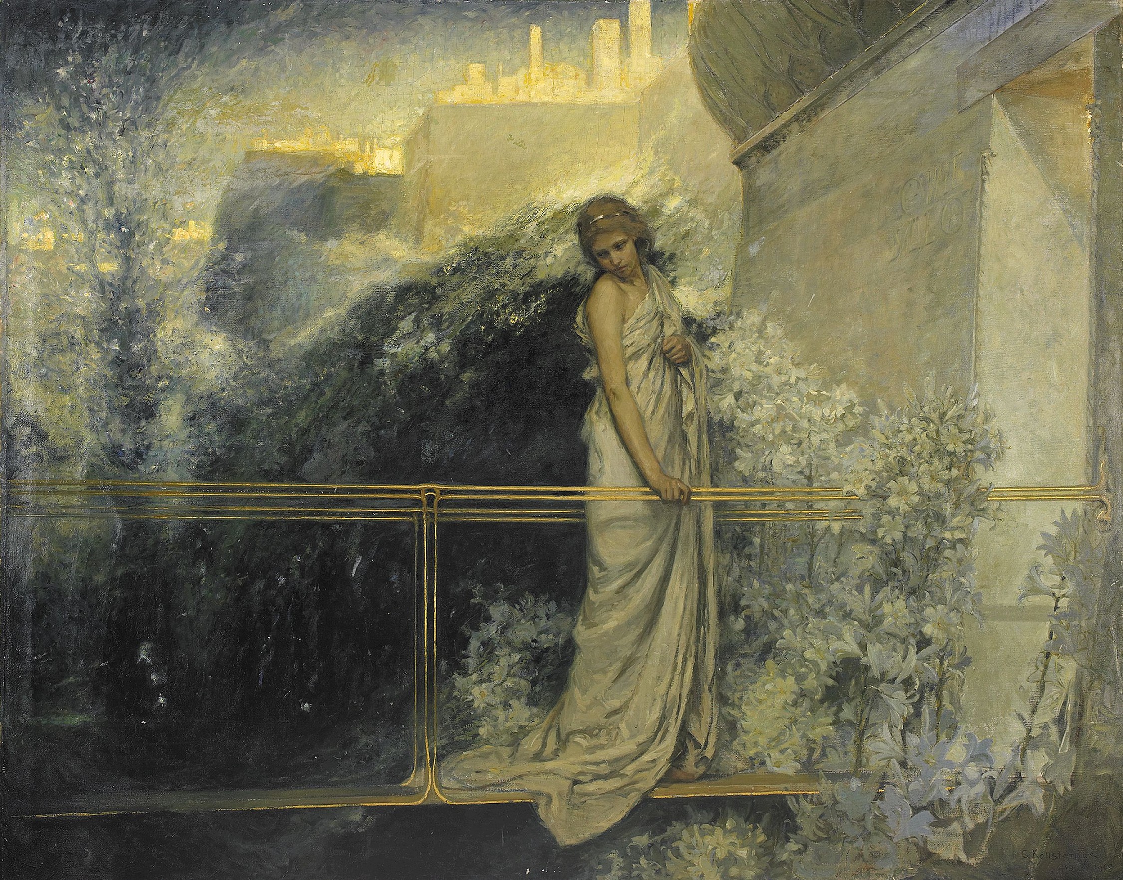 Beyaz giysili bir kadın, altın sarısı bir korkuluğa yaslanmıştır. Çevresinde beyaz çiçekler, arka planda koyu gölgeler ve yukarıda altın bir ışık vardır.