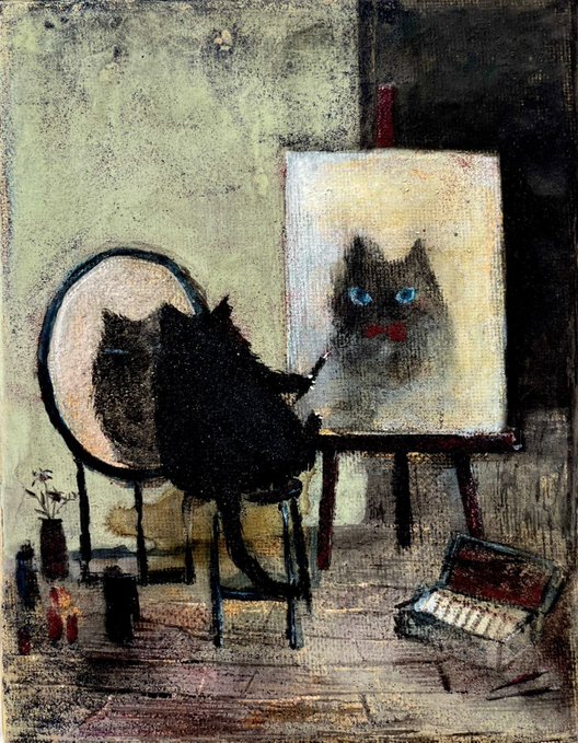Tip: “Atölyede otoportre” tipinin yerine “atölyede avatar” tipi geçer: özne, insan yüzü değil; bir temsil aracı (kedi) üzerinden kurulur.