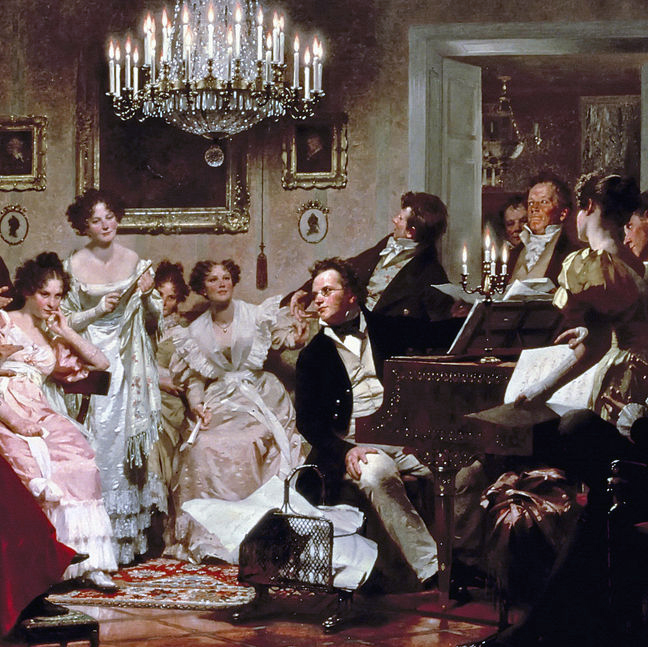 Resim, Avusturyalı besteci Franz Schubert (1797–1828)’in ünlü “Schubertiade”lerinden birini temsil eder. Schubertiade, Schubert’in müziğini dostları ve sanatseverlerle paylaştığı özel salon konserleridir. Bu toplantılar, yalnızca müzik değil, aynı zamanda entelektüel paylaşımın mekânıydı.