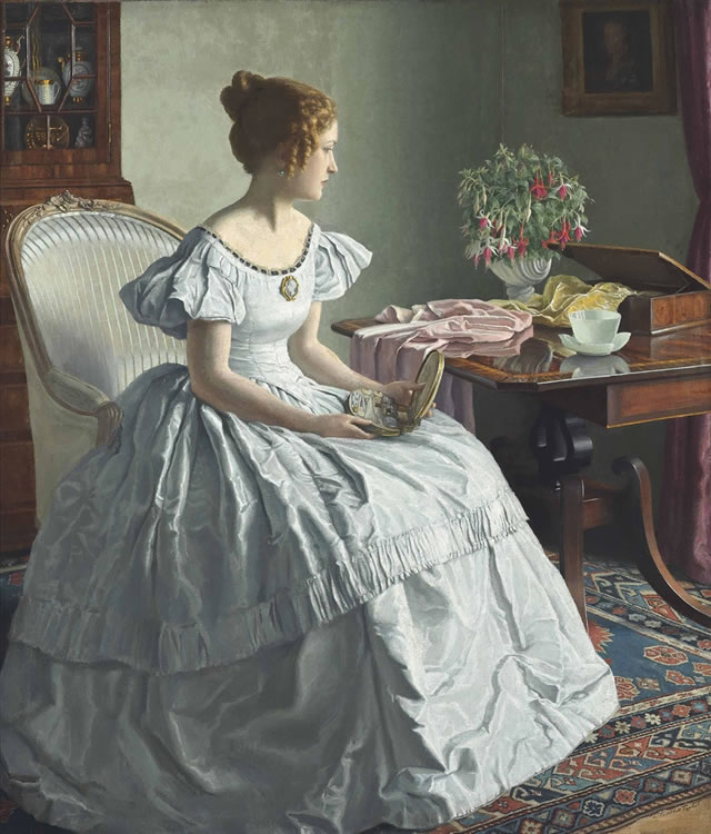 Bu tabloda beyaz elbiseli genç bir kadın, klasik bir koltukta oturmuş, elinde küçük bir kutu veya mücevher tutmaktadır. Figür, yan tarafa dönük bir şekilde düşünceli ve içe kapanık bir tavırla betimlenmiştir. Onun oturduğu mekân, dönemin tipik burjuva iç mekânını yansıtır: ahşap mobilyalar, çiçekli bir vazo, çay fincanı, yazı masası ve özenle serilmiş kumaşlar.