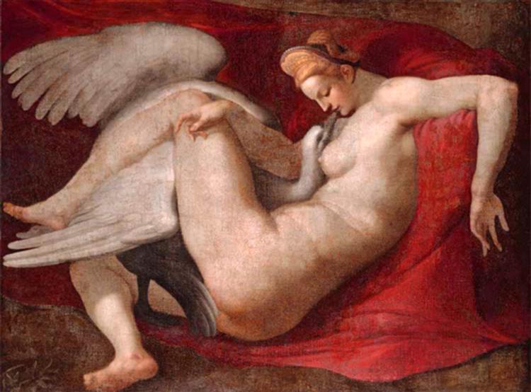 Not: Michelangelo’nun boyadığı özgün Leda ve Kuğu paneli günümüze ulaşmamıştır (muhtemelen 1520’lerin sonu). Yapıt kompozisyon olarak, atölye/kopya resimler ve 16. yüzyıl gravürleri (ör. Cornelis Bos) sayesinde bilinir. Bugün dolaşımda olan pek çok tablo, bu kayıp özgünün “sonrası/üzerine” çalışmalardır.