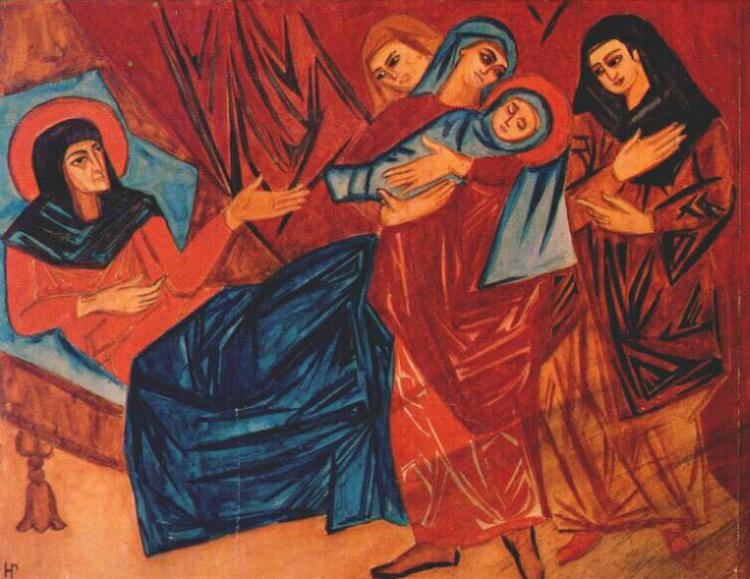 Natalia Goncharova, 20. yüzyıl başı Rus avangardının en önemli isimlerinden biridir. Resminde halk resmi, ikon geleneği, köylü hayatı ve modern biçim arayışı aynı yüzeyde buluşur. Onun figürleri akademik hacim anlayışına göre değil, düzleşmiş alanlar, sert konturlar ve bilinçli sadeleştirmelerle kurulur. Bu yüzden Goncharova’nın resmi yalnız modern değil; aynı zamanda Rus görsel hafızasının eski katmanlarını da taşıyan bir resimdir. Dinsel sahneleri işlerken de Batı’daki natüralist kutsallık yerine, daha doğrudan, daha düzlemsel ve daha törensel bir görsellik kurar.