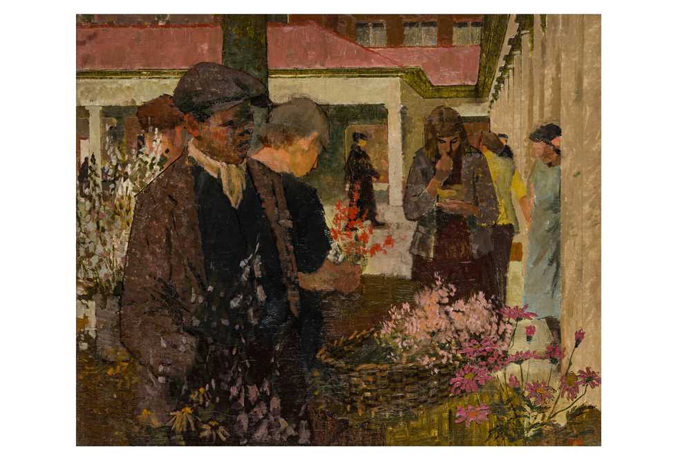 The Flower Stall, kapalı çarşı koridorunda kurulmuş figürlü bir kent sahnesidir. Sol ön planda kasketli erkek figürü ve hemen arkasındaki ikinci kişi kompozisyonun ana ağırlığını taşır. Sağ ön planda sepet içinde pembe çiçekler, sağ kenarda kolon sırası ve arkada açılan avlu benzeri boşluk sahneyi derinleştirir. Ortadaki kadın figürünün başını hafifçe eğerek elindeki nesneye bakması, resmin ana ritmini belirler: burada bağıran bir pazar değil, sessiz bir dolaşım vardır. Yapı, figürleri yan yana getirir ama birbirine tam olarak karıştırmaz. Herkes aynı mekândadır; ama herkes kendi küçük yalnızlığını taşır.