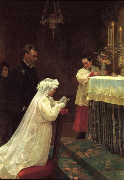 Karanlık bir kilise iç mekânında, beyaz giyimli genç bir kız diz çökmüş hâlde dua kitabını okur. Arkasında siyah giysili yetişkin bir erkek figürü, ağır ve koruyucu bir gölge gibi durur. Sağda yükselen altar platformu üzerinde rahip, örtülü masaya yaslanmış; mumlar, çiçekler ve parlayan metal yüzeyler ayinin resmî atmosferini güçlendirir. Kompozisyon, kızın beyazlığı ile arka planın koyuluğu arasında sert bir karşıtlık kurar; merasim “ışıkta” değil, daha çok gölgede ciddiyet kazanır. Kızın konumu alçakta, altar yukarıda olduğu için resim, mekânı bir hiyerarşi olarak düzenler: basamaklar yalnız fiziksel değil, sembolik bir yükselme çizgisidir.