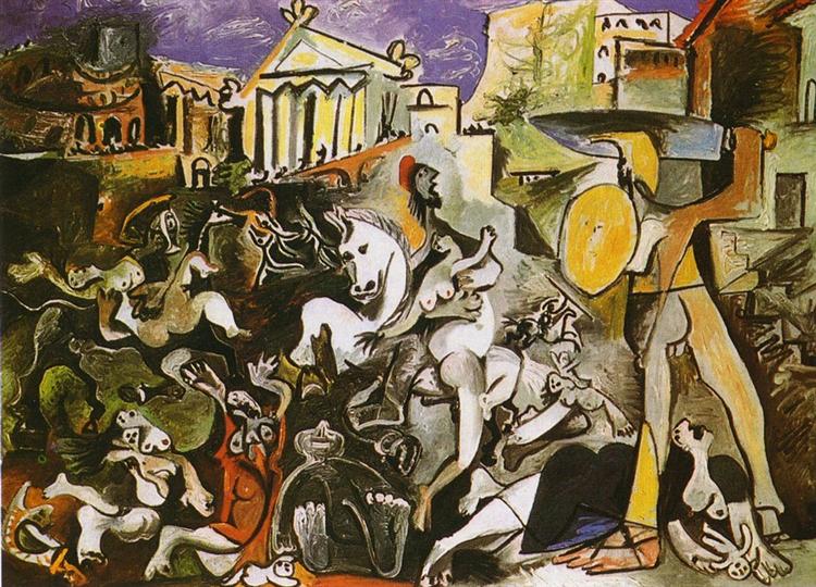 Pablo Picasso, 20. yüzyıl sanatının en belirleyici figürlerinden biridir. Kübizmle açtığı biçimsel kırılmanın ötesinde, figürü bozma, bedeni parçalama ve tarihi modern şiddetin diliyle yeniden resmetme gücüyle de öne çıkar. Onun geç dönem resimlerinde klasik konular, mitolojik anlatılar ve eski ustalara yapılan göndermeler giderek daha sert, daha dağınık ve daha bedensel bir hale gelir. Bu yüzden Picasso’da tarihsel sahne hiçbir zaman yalnız geçmişe ait değildir; daima çağdaş şiddetin, arzu rejiminin ve insanın karanlık itkilerinin alanına geri döner.