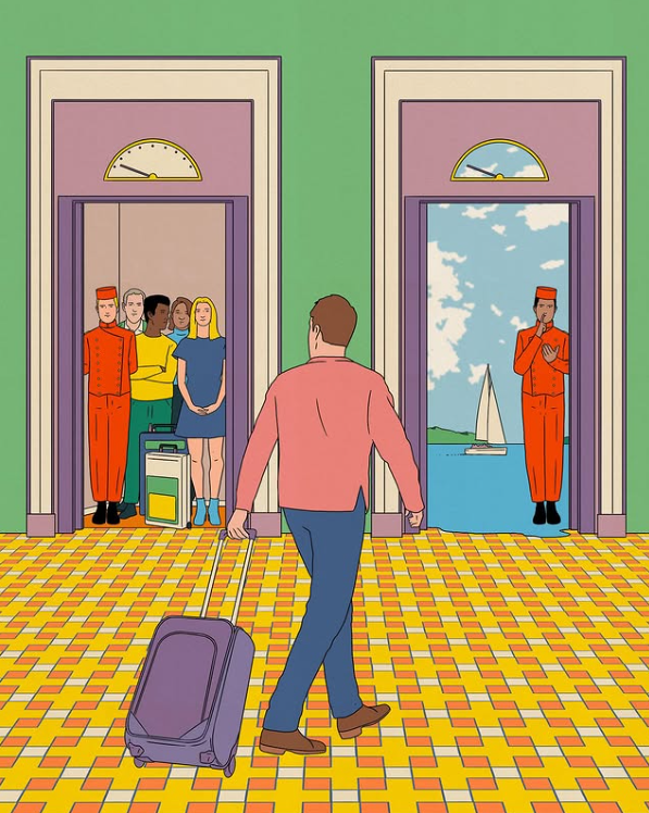 Simon Bailly’nin dikkat çekici eserlerinden biri olan A Secret– İki Kapı Arasında-, sanatçının tüm tematik izleğini tek bir sahnede görselleştirdiği yoğunluklu bir kompozisyondur. Görselde bir adam, valizini çekerek iki asansör arasında yürümektedir. Sol asansör kalabalıktır; birkaç yolcu, görevli, bavul, içe dönük ve beklenti dolu bir atmosfer… Sağ asansör ise boştur; sadece bir görevli vardır ve arka planda geniş bir manzara: açık deniz, yelkenli, bulutsuz bir gökyüzü.