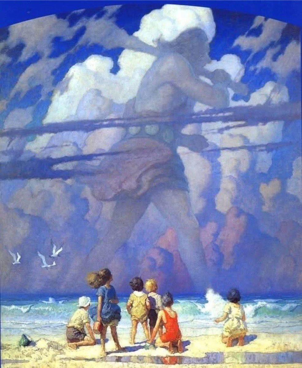 N.C. Wyeth’in The Giant adlı eseri, yalnızca bir devin resmini yapmaz; hayal kurma eyleminin kendisini görselleştirir. Çocukların gözleri, devin varlığını değil; kendi içlerindeki hayal gücünü seyreder. Bu, kolektif bir düş anıdır: gerçek dışı olanın gerçekmiş gibi kabul edildiği, zamanın askıya alındığı bir sahne.