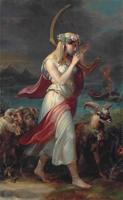 Dikey kompozisyonun merkezinde genç bir çoban kızı, çıplak ayaklarıyla su kıyısında yürürken lirini çalar. Başında çiçekten bir taç, omuzlarında yarı şeffaf beyaz bir elbise ve onu çaprazlayan şarap-kırmızısı bir örtü vardır. Solunda koyun sürüsü, sağında kıvrık boynuzlu bir teke—bakışları figüre dönük—ilerler. Arka planda sakin bir su, ufukta maviye eriyen gökyüzü, daha ötede iki piramit ve Nil üzerinde bir kayık silueti görülür. Sağ altta lotus/papirüs bitkileri su yüzeyinden yükselir. Işık yandan gelir; elbisenin beyazı içten yanıyormuşçasına parlar, kırmızı örtü rüzgârla kıvrılır. Figürün adımı küçük ama karardı; lir ile beden arasındaki diyagonal, tüm sahnenin ritmini taşır.